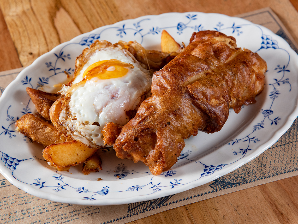 Congrio, cebolla caramelizada, huevos fritos y papas fritas.